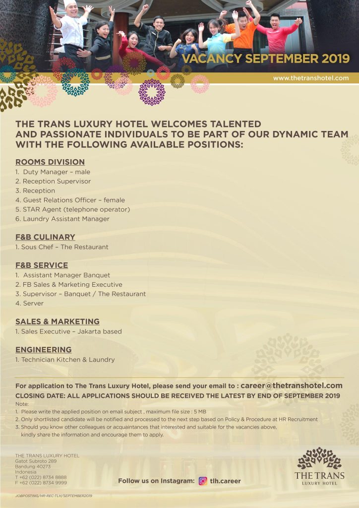 The Trans Luxury Hotel Bandung is inviting talented and passionate individuals to be part of our dynamic team with the following positions :